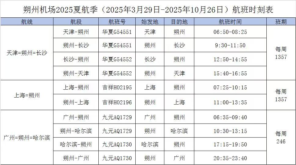 朔州机场2025夏航季(2025年3月29日-2025年10月26日)航班时刻表